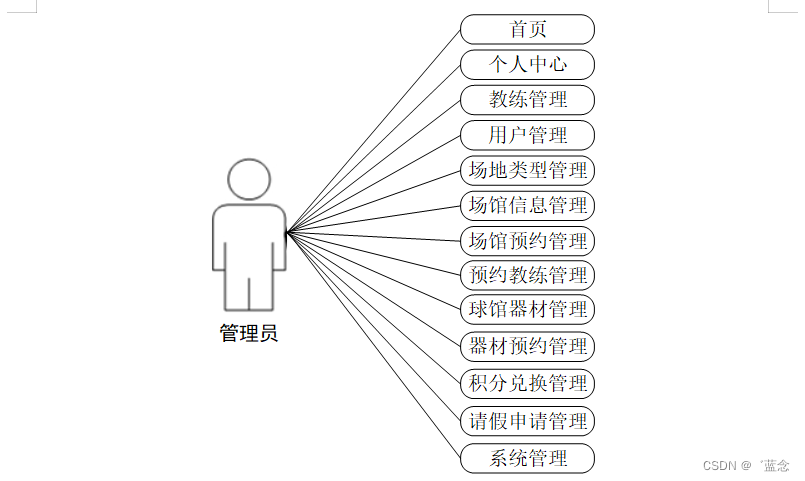 管理员使用本系统涉到的功能主要有首页,个人中心,教练管理,用户管理,场地类型管理,场馆信息管理,场馆预约管理,预约教练管理,球馆器材管理,器材预约管理,积分兑换管理,请假申请管理,系统管理等功能。管理员用例如图3-1所示。