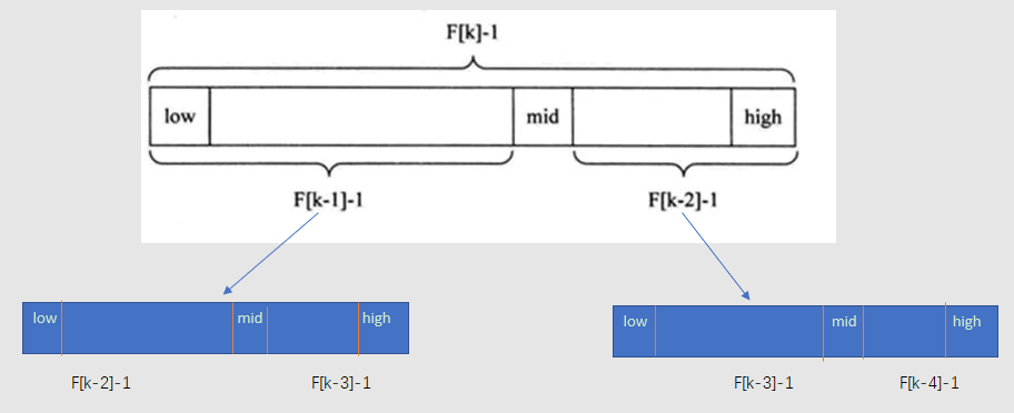 该式说明:只要顺序表的长度为 F[k]-1,则可以将该表分成长度为 F[k-1]-1 和 F[k-2]-1 的两段,即如上图所示。从而中间位置为 mid=low+F(k-1)-1。