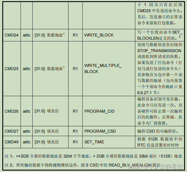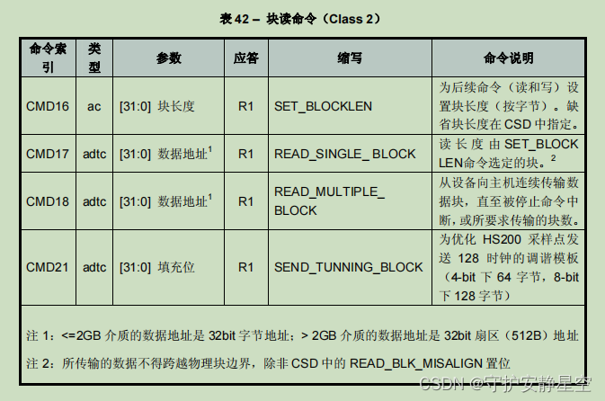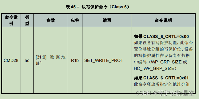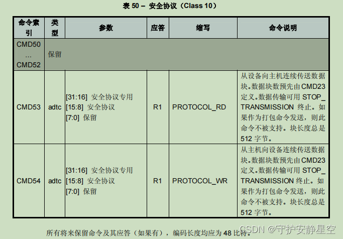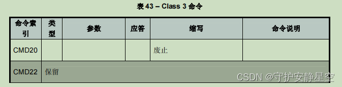 | 类说明 所支持命令 | 基本 | 废止 | 块读 | 废止 | 块写 | 擦 | 写保护 | 锁设备 | 应用专有 | I/O模式 | 安全协议 | 保留 |