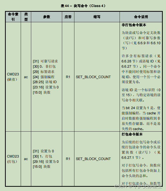 下列各表详细定义了所有 e•MMC 总线命令。应答 R1-R5 在 6.12 节定义。寄存器 CID, CSD, EXT_CSD 和 DSR 在后面 定义。