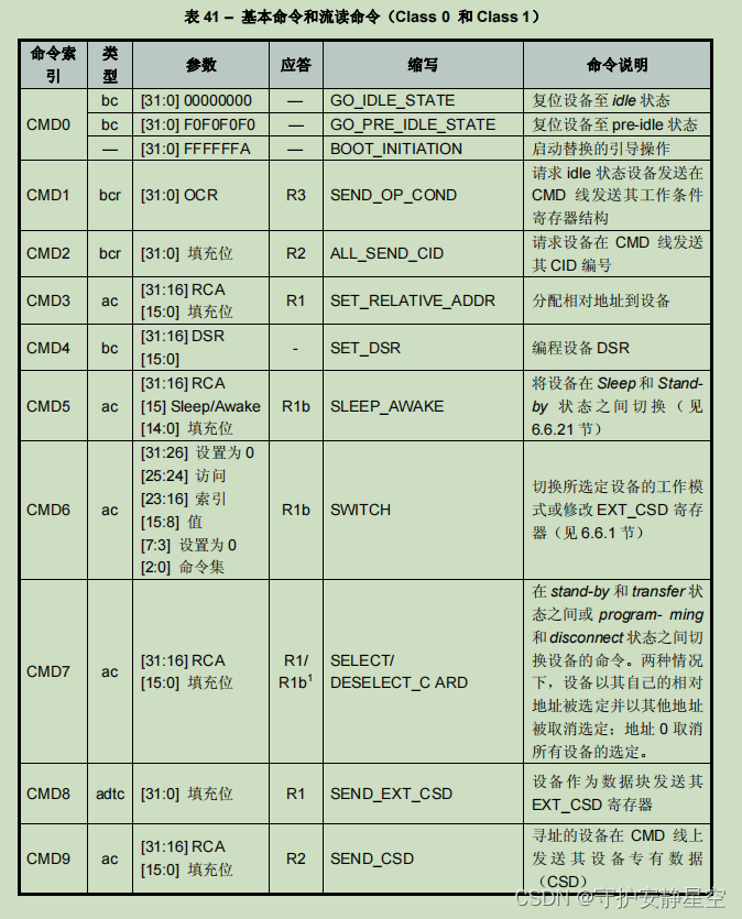 | Class 0 是必需的,所有的设备均应支持。其他类对特定类型设备可能是必需的,也可 能是可选的(设备类型功能所支持的命令类详见 11 节)。通过使用不同的类,可以选择几 种结构(例如块可写设备或流可读设备)。每一张设备所支持的设备命令类编码为设备专有 数据寄存器(CSD)中的参数(CCC),向主机提供访问设备方法的信息。 | ||||||||||||