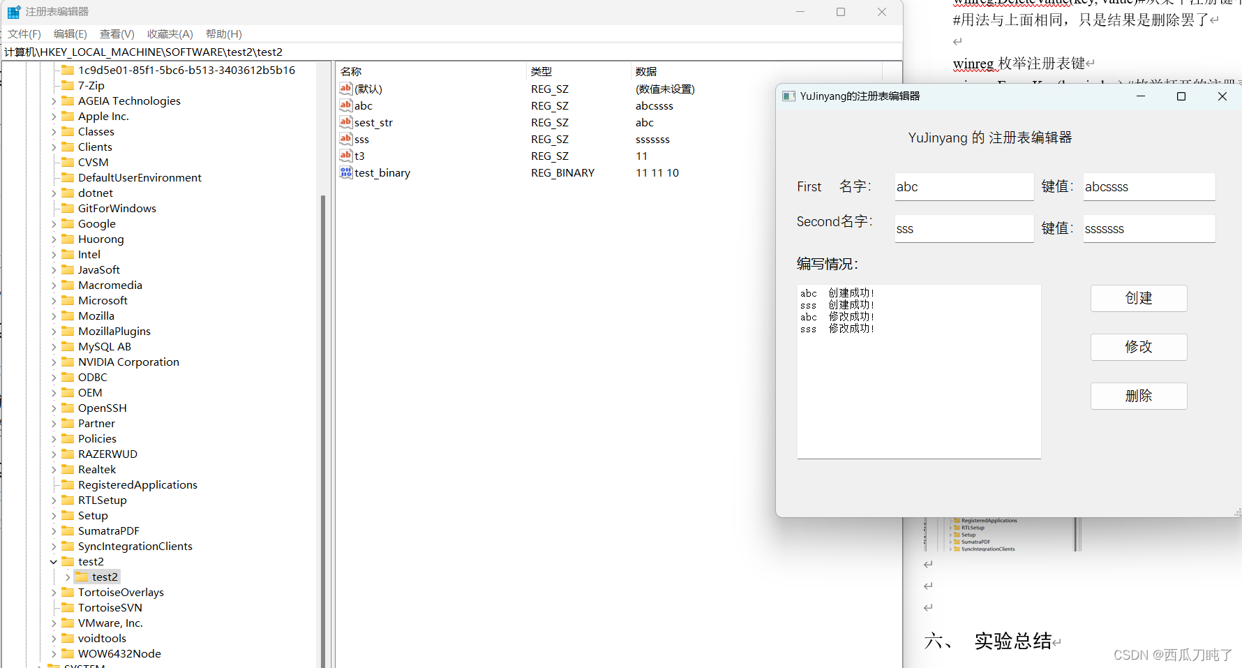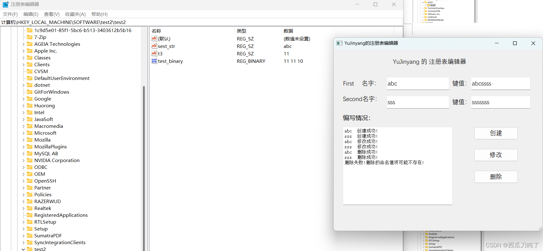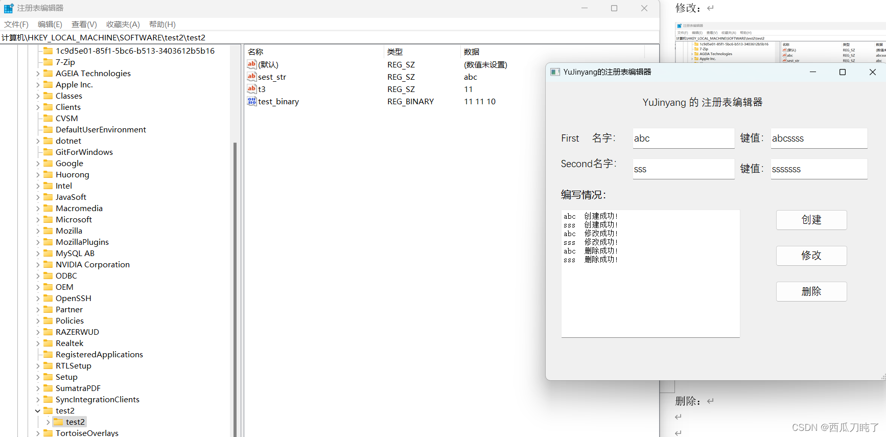 1. 注册表增删改工具:(具体修改的位置为SOFTWARE\test2\test2)