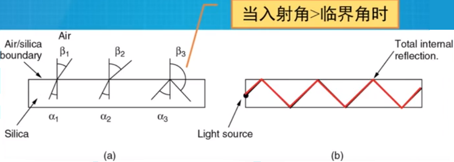 光纤(工作原理)——光的全反射 光全部被锁闭在光密物质中 全反射前行
