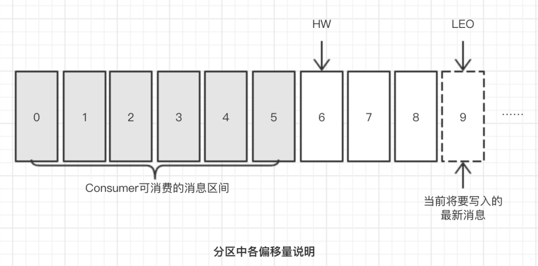 分区IRS集合中的每个副本都会维护自身的LEO,而IRS集合中最小的LEO即为分区的HW,对消费者而言只能消费HW之前的消息。
