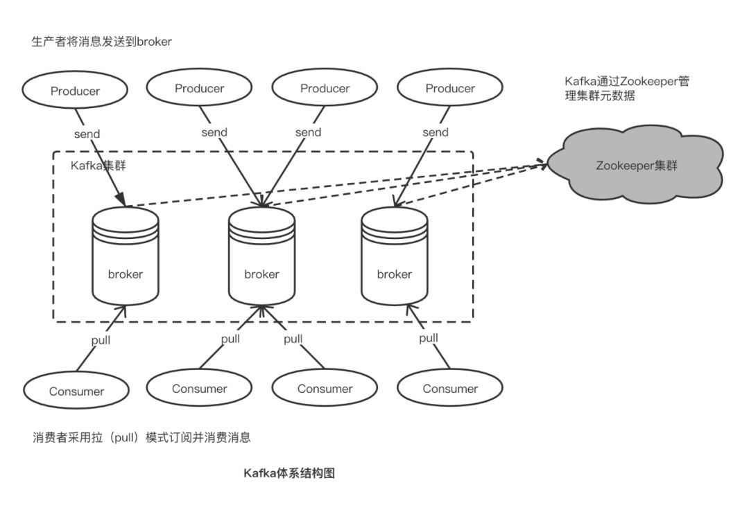 其中,Zookeeper是Kafka用来负责集群元数据管理、控制器的选举等操作的。Producer将消息发送到broker,broker负责将收到的消息存储到磁盘中,然后Consumer负责从broker订阅并消费消息(Consumer是使用拉(Pull模式)从服务端拉取消息)。