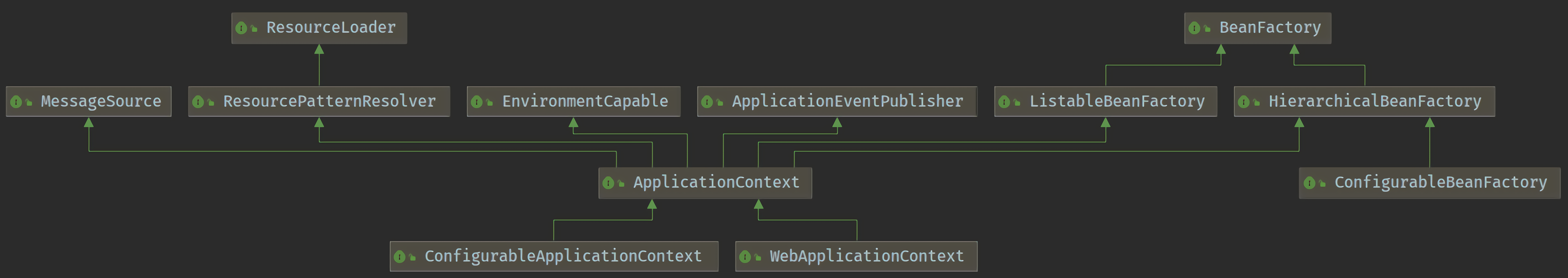 ApplicationContext为核心。从BeanFactory到ListableBeanFactory到ApplicationContext,再到ConfigurableApplicationContext或WebApplicationContext。我们常用的上下文基本都是ConfigurableApplicationContext或WebApplicationContext的实现类