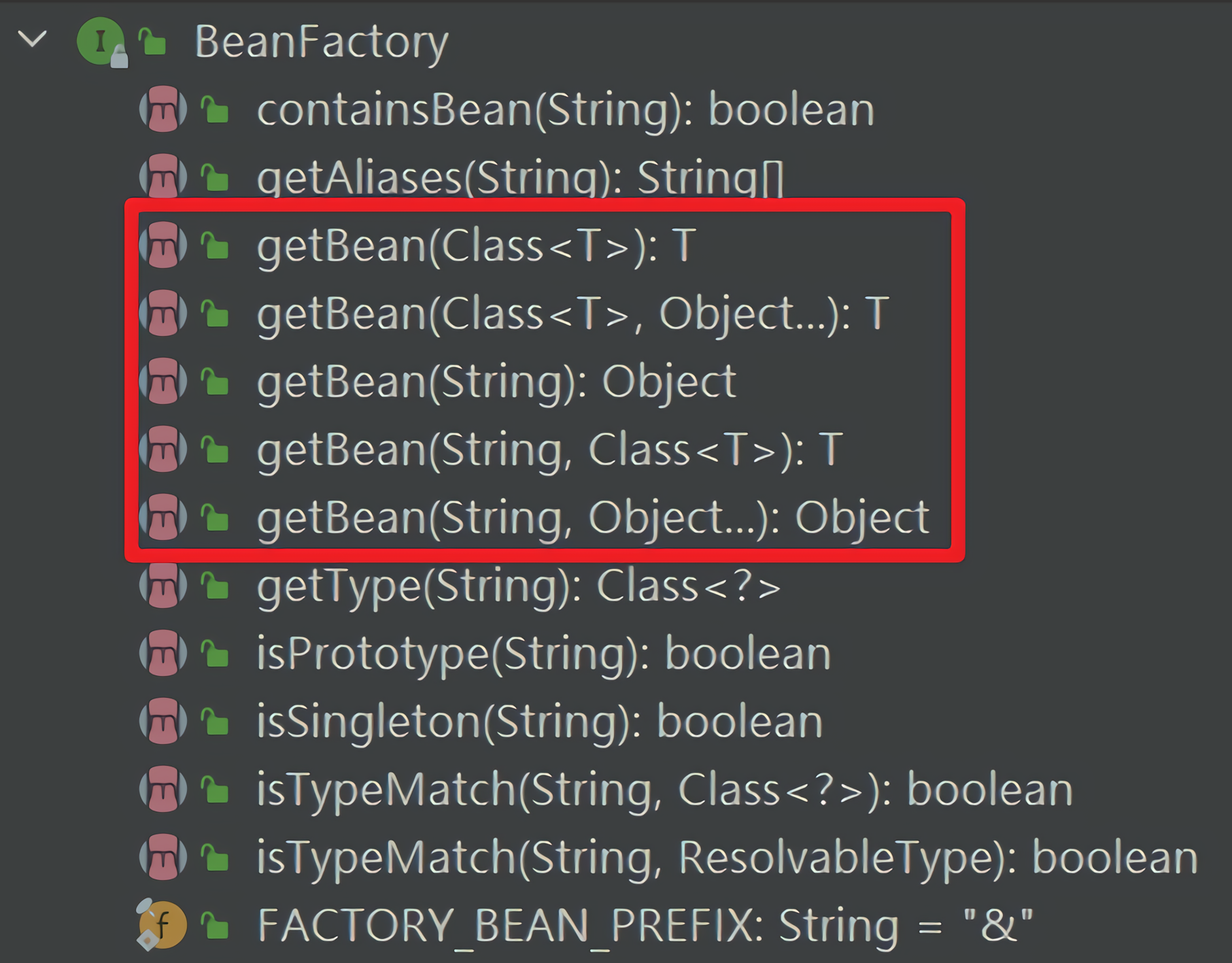 boolean containsBean(String name);容器中是否有名为name的BeanString[] getAliases(String name);查询Bean的所有别名getBean()有多个重载方法,是从容器中获取Bean实例的方法(此方法包含如果获取不到就创建一个Bean实例的流程)boolean isSingleton(String name);返回Bean是否是单实例boolean isPrototype(String name)返回Bean是否是多实例(Bean是单实例还是多实例,这些信息保存在对应的BeanDefinition对象中)- ...