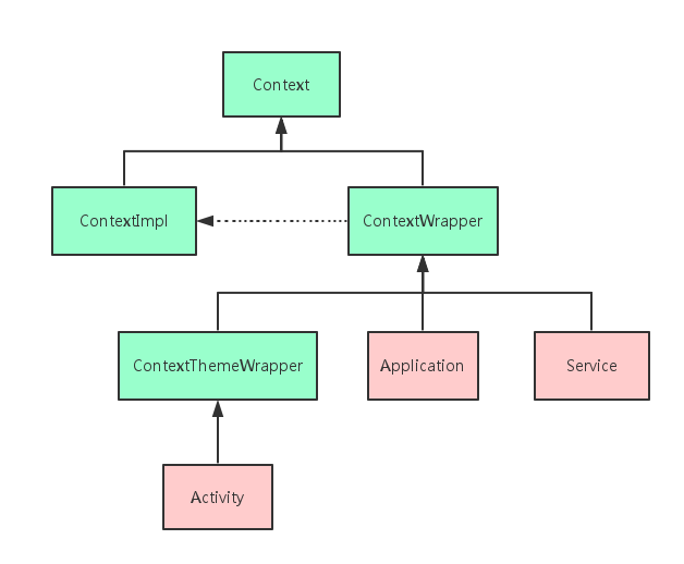 Context 类本身是一个纯 abstract 类,它有两个具体的实现子类:ContextImpl 和 ContextWrapper。其中 ContextWrapper 类,如其名所言,这只是一个包装而已,ContextWrapper 构造函数中必须包含一个真正的 Context 引用,同时 ContextWrapper 中提供了 attachBaseContext()用于给 ContextWrapper 对象中指定真正的 Context 对象,调用 ContextWrapper 的方法都会被转向其所包含的真正的 Context 对象。ContextThemeWrapper 类,如其名所言,其内部包含了与主题(Theme)相关的接口,这里所说的主题就是指在 AndroidManifest.xml 中通过 android:theme 为 Application 元素或者 Activity 元素指定的主题。当然,只有 Activity 才需要主题,Service 是不需要主题的,因为 Service 是没有界面的后台场景,所以 Service 直接继承于 ContextWrapper,Application 同理。而 ContextImpl 类则真正实现了 Context 中的所以函数,应用程序中所调用的各种 Context 类的方法,其实现均来自于该类。一句话总结:**Context 的两个子类分工明确,其中 ContextImpl 是 Context 的具体实现类,ContextWrapper 是 Context 的包装类。**Activity,Application,Service 虽都继承自 ContextWrapper(Activity 继承自 ContextWrapper 的子类 ContextThemeWrapper),但它们初始化的过程中都会创建 ContextImpl 对象,由 ContextImpl 实现 Context 中的方法。