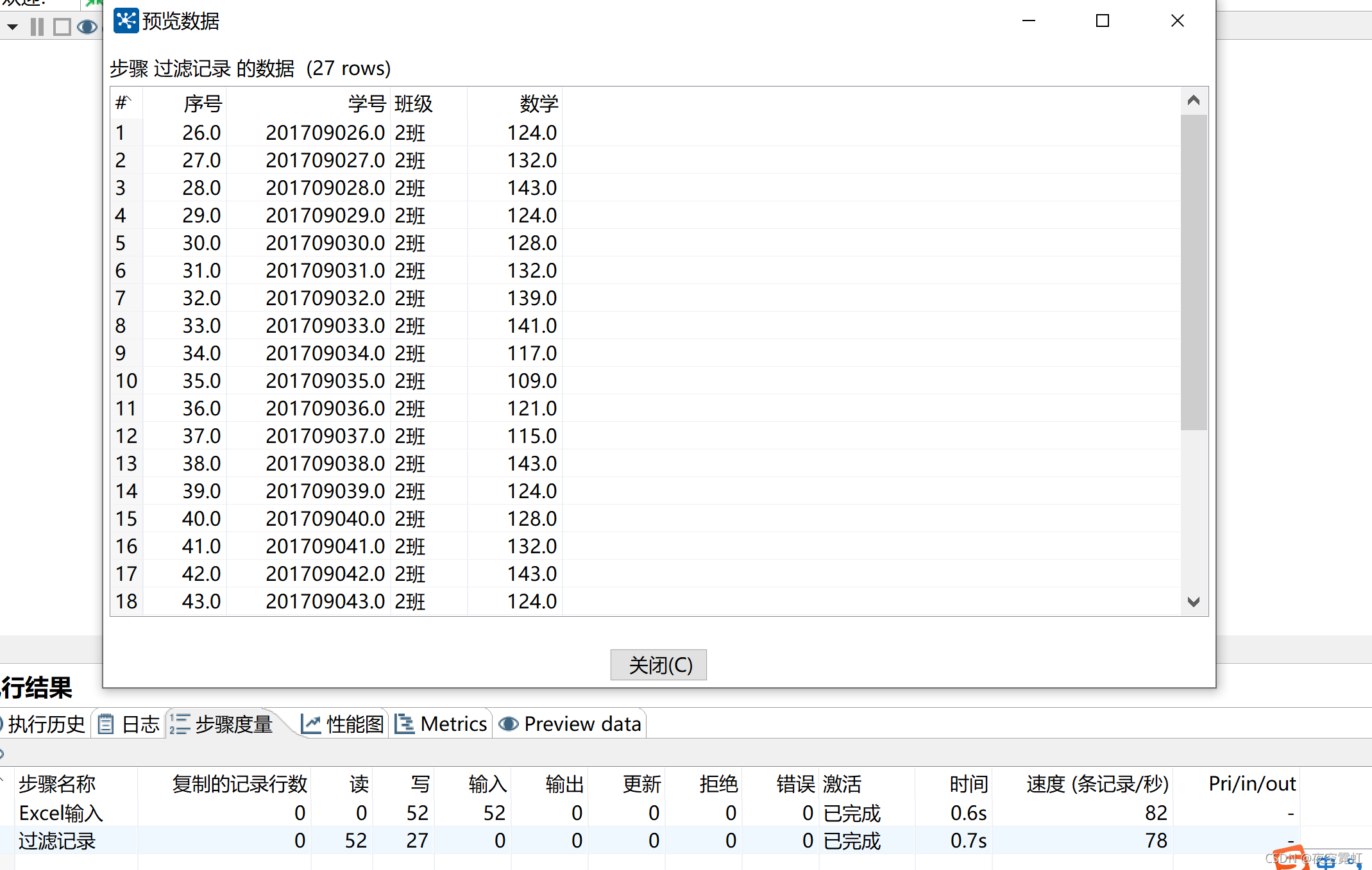 任务描述:在数据处理时,往往需要对数据所属类别、区域和时间等进行限制,将限制范围外的数据过滤掉。为了统计2班的考试人数和成绩,需要对“2019年10月年级月考数学成绩.xls”文件,使用【过滤记录】组件,过滤掉不是2班的数据。