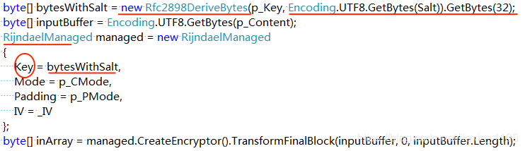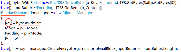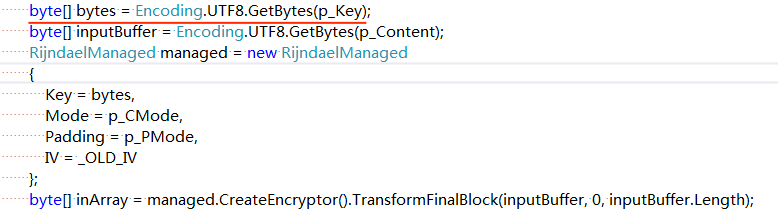 public static string Encrypt(string p_Content, string p_Key){return Encrypt(PaddingMode.PKCS7, CipherMode.CBC, p_Content, p_Key);}public static string Encrypt(PaddingMode p_PMode, CipherMode p_CMode, string p_Content, string p_Key){byte[] bytes = Encoding.UTF8.GetBytes(p_Key);byte[] inputBuffer = Encoding.UTF8.GetBytes(p_Content);RijndaelManaged managed = new RijndaelManaged{Key = bytes,Mode = p_CMode,Padding = p_PMode,IV = _IV};byte[] inArray = managed.CreateEncryptor().TransformFinalBlock(inputBuffer, 0, inputBuffer.Length);return Convert.ToBase64String(inArray, 0, inArray.Length);}