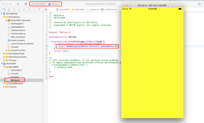 这时候SDK跟Demo就关联起来了,此时修改下面SDK中的代码,运行demo就是修改后的效果,然后就可以愉快的在这个工程里面开发调试SDK了,如果我把MyView的颜色设置为yellow,再去运行demo,看一下效果