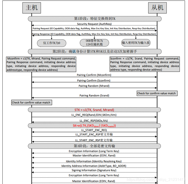 - 第2阶段交换确认值以及计算确认值所用到的随机数, 首先主机发送确认值给从机,从机也发送确认值给主机,之后主机发送随机数给从机,当从机接到随机数后,开始计算确认值,当计数的确认值和主机发过来的确认值一样,则从机也发送随机数给主机,否则就不发送随机数给主机,因为有可能受到攻击。 如果主从都交换了计算确认值的随机数后,各自会计算出短期密钥STK