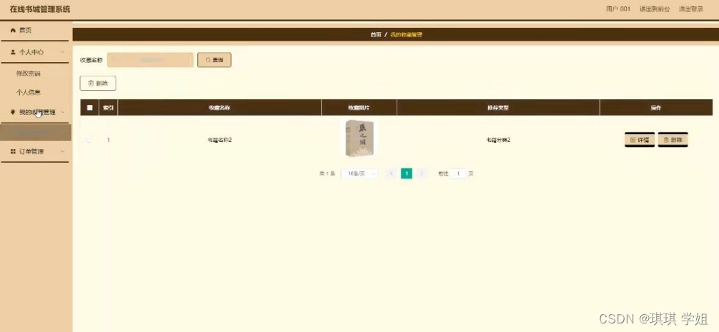 我的收藏管理,在我的收藏管理页面可以对索引,收藏名称,收藏图片,推荐类型等内容进行详情或删除操作,如图5-16所示。