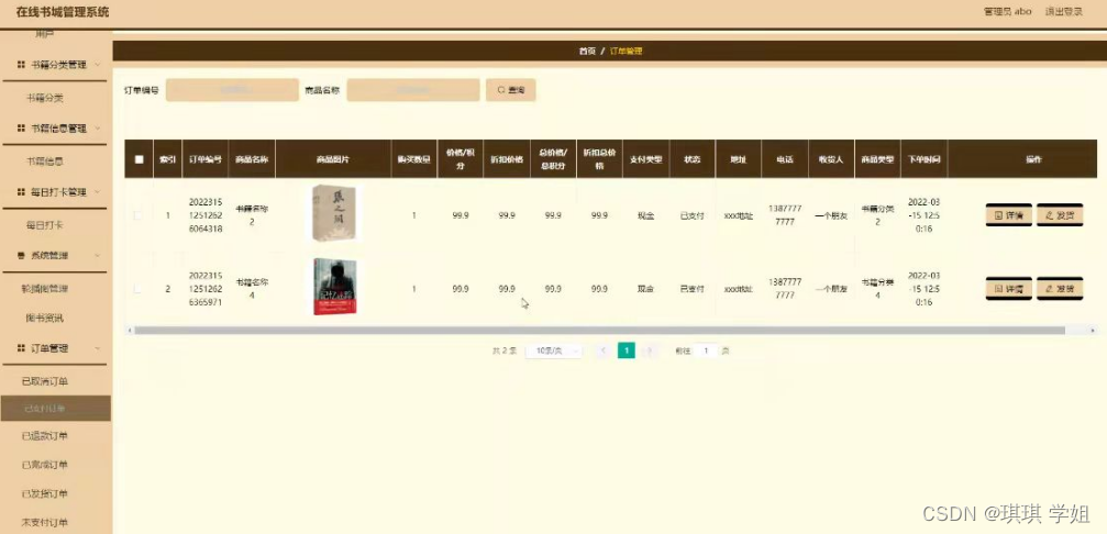 订单管理,在已支付订单页面可以对索引,订单编号,商品名称,商品图片,购买数量,价格/积分,折扣价格,总价格/总积分,折扣总价格,支付类型,状态,地址,电话,收货人,商品类型,下单时间等内容进行详情和发货等操作,如图5-13所示。