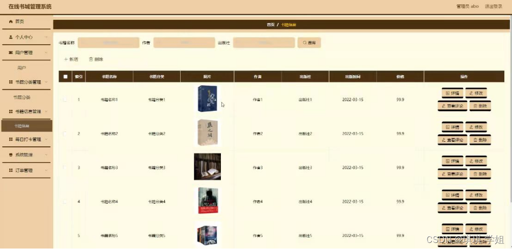 书籍信息管理,在书籍信息管理页面可以对索引,书籍名称,书籍分类,图片,作者,出版社,出版时间,价格等内容进行详情,修改,查看评论和删除等操作,如图5-10所示。
