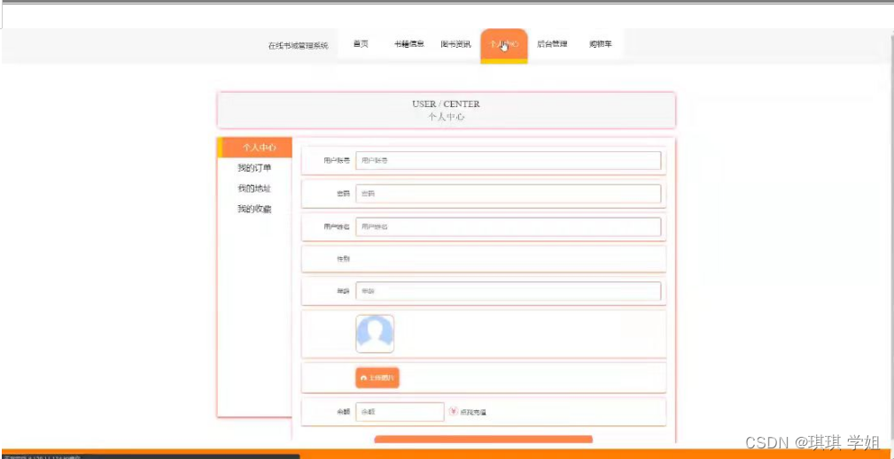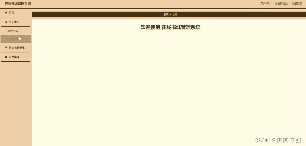 用户登录进入在线书城管理系统可以对首页,个人中心,我的收藏管理,订单管理等功能进行相应操作,如图5-14所示。