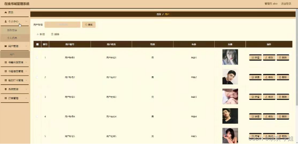 用户管理,在用户管理页面可以对索引,用户账号,用户姓名,性别,年龄,头像等内容进行详情,修改和删除等操作,如图5-8所示。