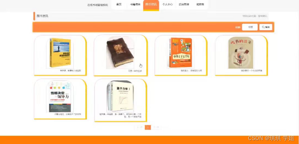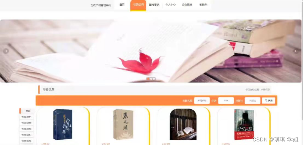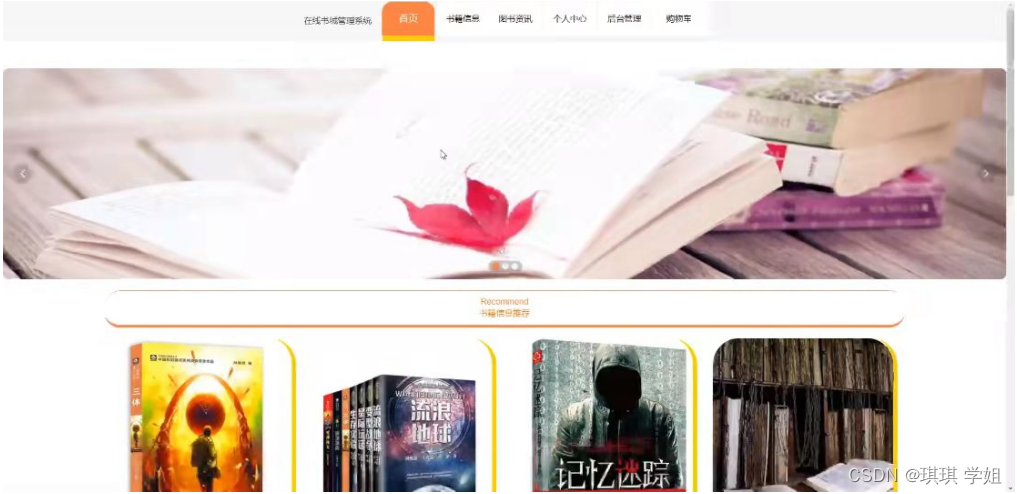 在线书城管理系统,在系统首页可以查看首页,书籍信息,图书资讯,个人中心,后台管理,购物车等内容,并进行详细操作;如图5-1所示。
