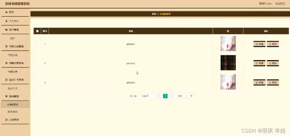 系统管理,在轮播图管理可以对索引,名称,值等内容进行详情,或修改等操作,如图5-12所示。