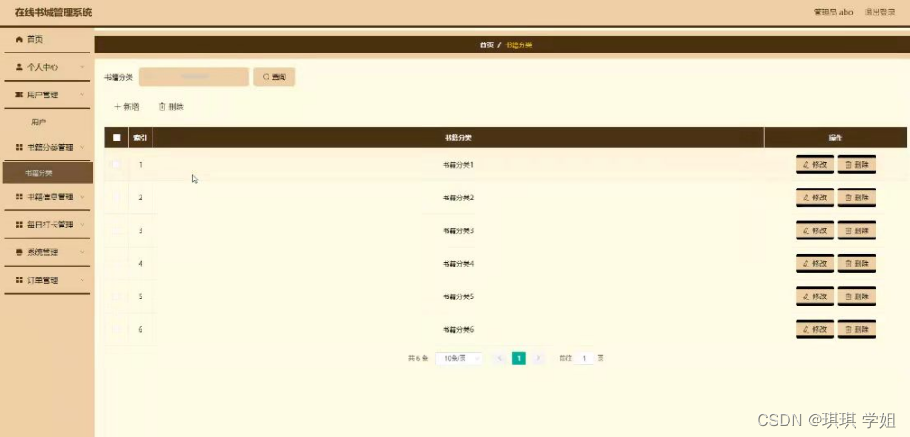 书籍分类管理,在书籍分类管理页面可以对索引,书籍分类等信息进行修改和删除等操作,如图5-9所示。