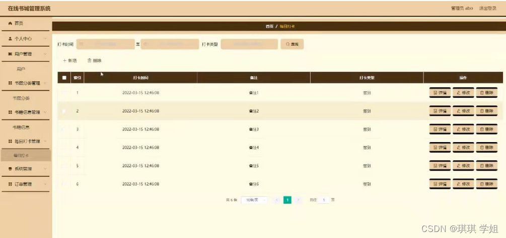 每日打卡管理,在每日打卡管理页面可以对索引,打卡时间,备注打卡类型等内容进行详情,修改和删除等操作,如图5-11所示。