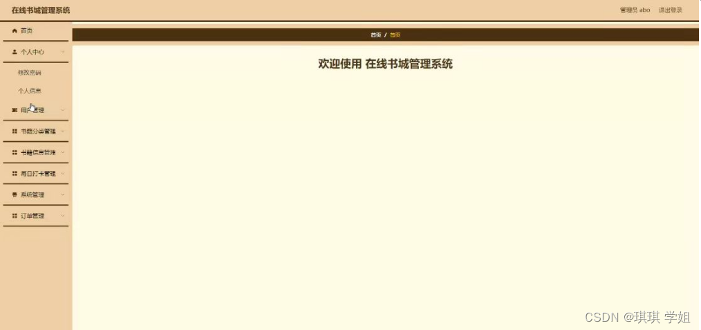 管理员登录系统后,可以对首页,个人中心,用户管理,书籍分类管理,书籍信息管理,每日打卡管理,系统管理。订单管理等功能进行相应的操作管理,如图5-7所示。