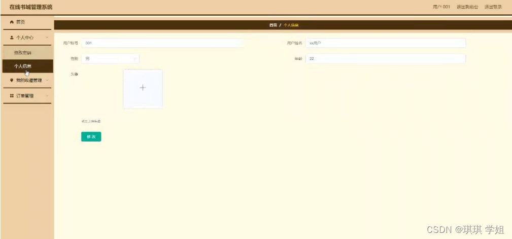 个人中心,在个人中心页面通过填写用户账号,用户姓名,性别,年龄,头像等内容进行个人信息修改操作,如图5-15所示。