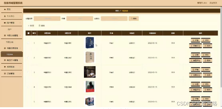 书籍信息管理,在书籍信息管理页面可以对索引,书籍名称,书籍分类,图片,作者,出版社,出版时间,价格等内容进行详情,修改,查看评论和删除等操作,如图5-10所示。