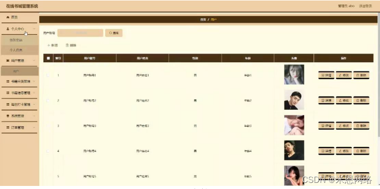 用户管理,在用户管理页面可以对索引,用户账号,用户姓名,性别,年龄,头像等内容进行详情,修改和删除等操作,如图5-8所示。