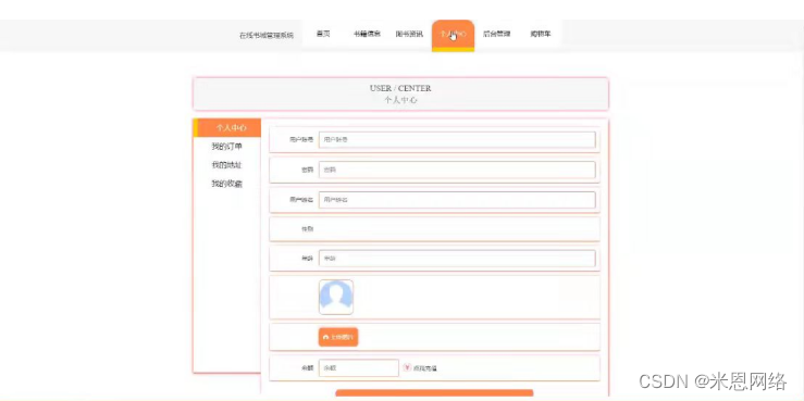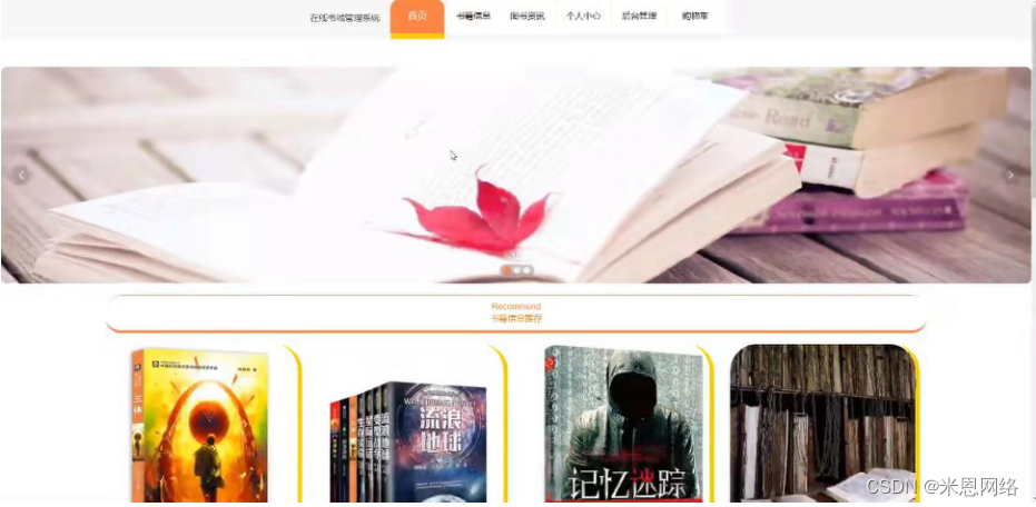 在线书城管理系统,在系统首页可以查看首页,书籍信息,图书资讯,个人中心,后台管理,购物车等内容,并进行详细操作;如图5-1所示。