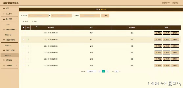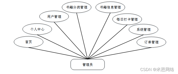 (3)在管理员模块中,管理员内容主要包括首页,个人中心,用户管理,书籍分类管理,书籍信息管理,每日打卡管理,系统管理。订单管理等功能。