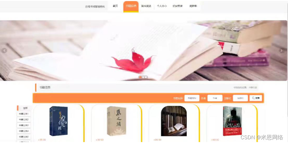 书籍信息,在书籍信息页面可以查看书籍分类,还可以对书籍名称,作者,出版社等内容进行搜索操作,如图5-3所示。