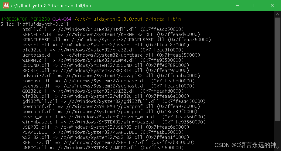 我们打开 MSYS2,并使用 MSYS2 自带的 ldd (LD Dependencies)命令查看它所依赖的所有 DLL 文件: