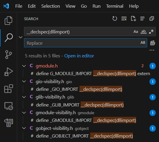 在 MSYS2 安装目录的 clang64/include/glib-2.0 文件夹下搜索关键字 __declspec(dllimport)。