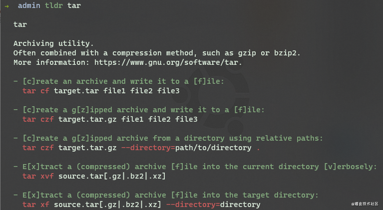 tdlr 是 Too long, Don't read 的缩写,可以帮助你快速查看常用命令的使用实例,比如 tar 命令,那后面一长串参数谁记得清呢?当然,linux 大佬除外。
