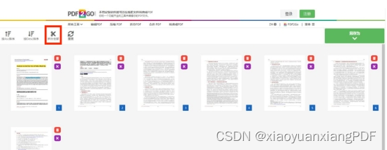 与小圆象PDF转换器相比,PDF2GO的功能稍少一些,但它也提供了拆分功能。在它的官方网站上找到【PDF拆分】功能,上传文档后,界面会显示文档每页的缩略图。你可以将整个文档进行拆分,如果要单独拆分某些部分,你需要手动删除其他部分。你还可以设置想要拆分的位置,点击【剪刀】图标,然后将剪刀放在你想要拆分的位置。例如,如果你想将第1/2页拆分在一起,只需在第2页和第3页的中间点击一下即可。后面的操作依此类推。如果文档的页数不太多,你也可以很快完成拆分。