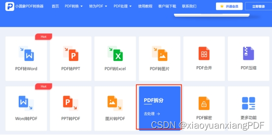 一般来说,PDF拆分的工具通常是需要付费的,但是我了解到一款软件提供免费试用次数,如果试用后觉得好用,可以下载到电脑上继续使用。这款名为"小圆象PDF转换器"的软件可以帮助你处理多种类型的文件,无论是合同文档、网页文件还是策划文案,你都可以在这里找到所需的转换功能。你可以在官方网站找到【PDF拆分】功能,然后开始处理文档。