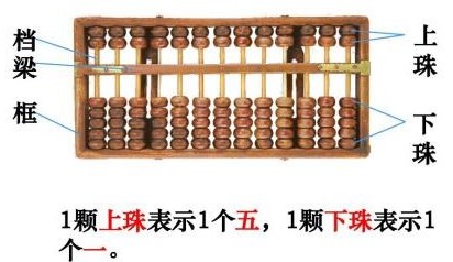 我们用下珠代表1,每五个珠子代表进1,即5进制。