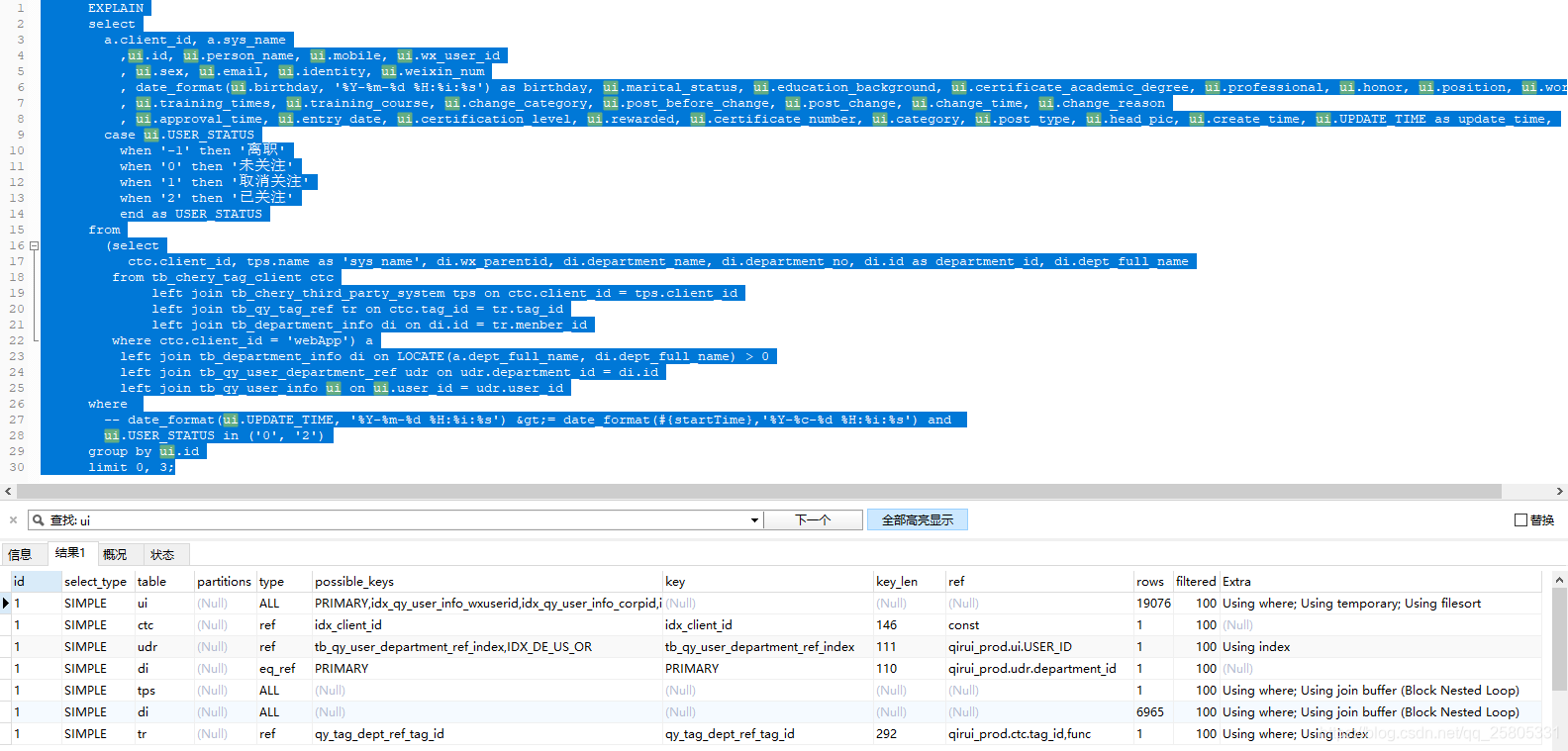 虽然到此,已经确定了问题的本质,但是还没有想到解决办法,初步猜想是因为limit的操作涉及到主键ui.id,并且ui.id进行分组,导致索引失效