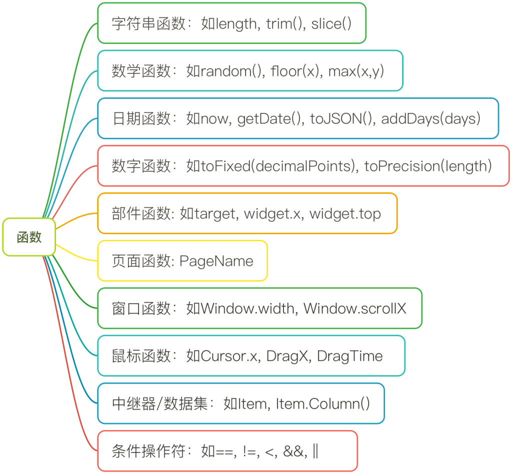 根据Axure函数的应用范围,可划分为以下10类:元件函数、页面函数、窗口函数、鼠标指针函数、数字函数、字符串函数、数学函数、日期函数、中继器函数和布尔运算符(逻辑运算)。