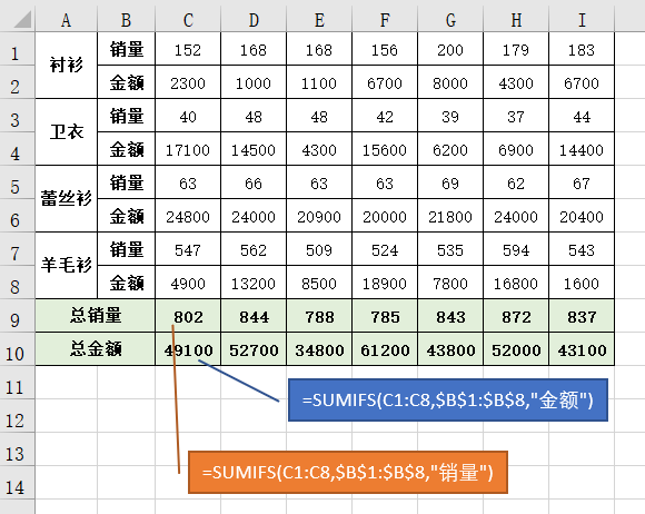 总销量公式:=SUMIFS(C1:C8,$B$1:$B$8,"销量")