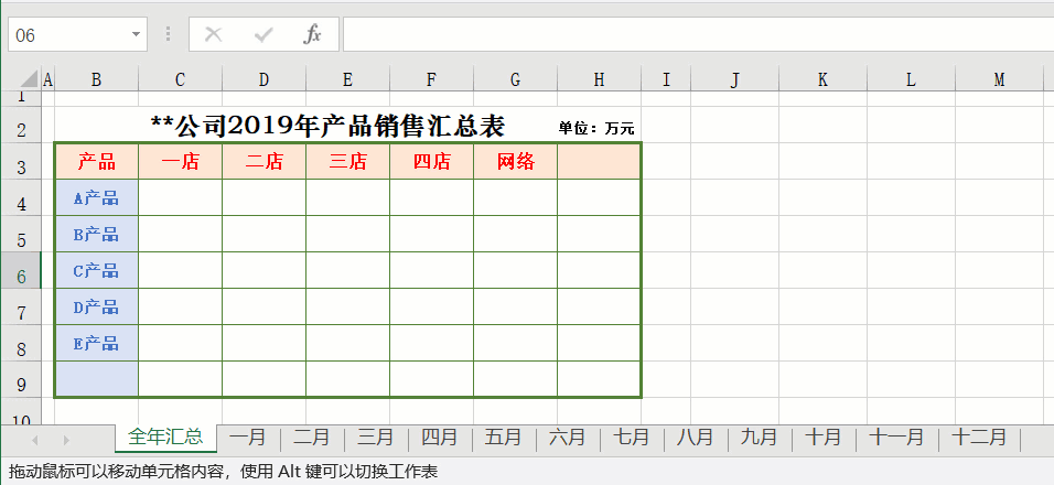 技巧:公式也可以选择,首先输入=SUM(),然后点击“一月”工作表标签,再按住键盘上的Shift键,点击“十二月”工作表标签,完成公式输入。