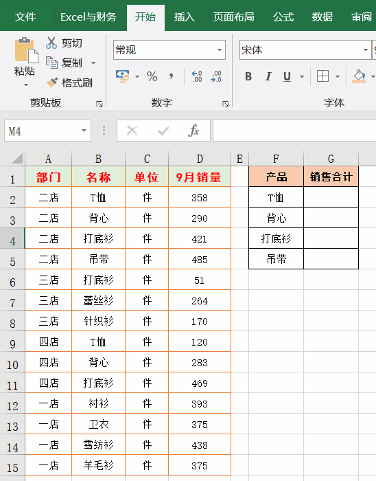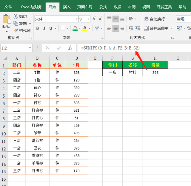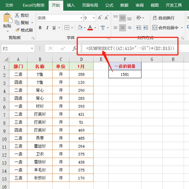 公式:=SUMPRODUCT((A2:A15="一店")*(D2:D15))