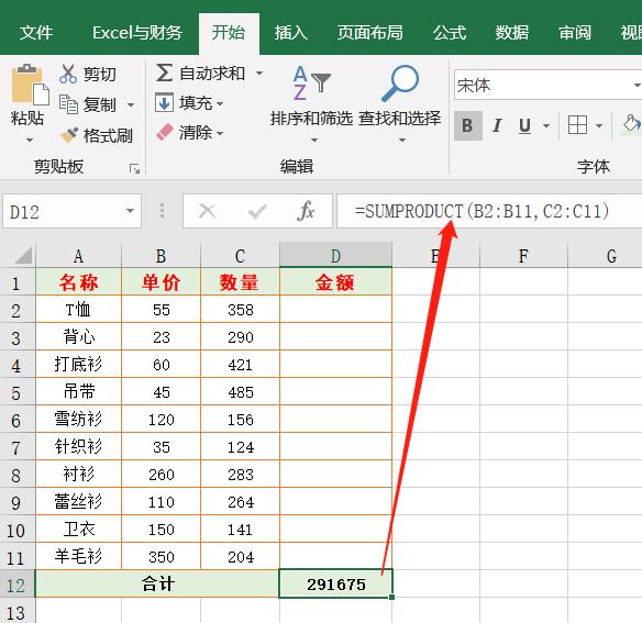 公式:=SUMPRODUCT(B2:B11,C2:C11)