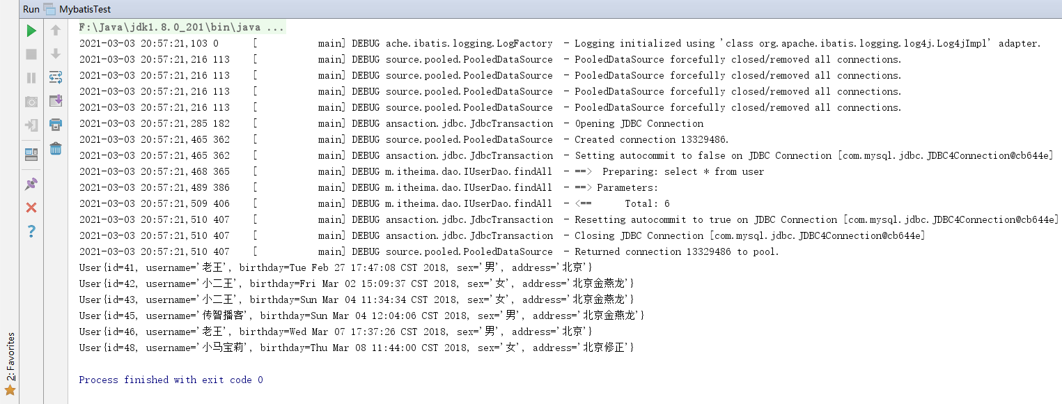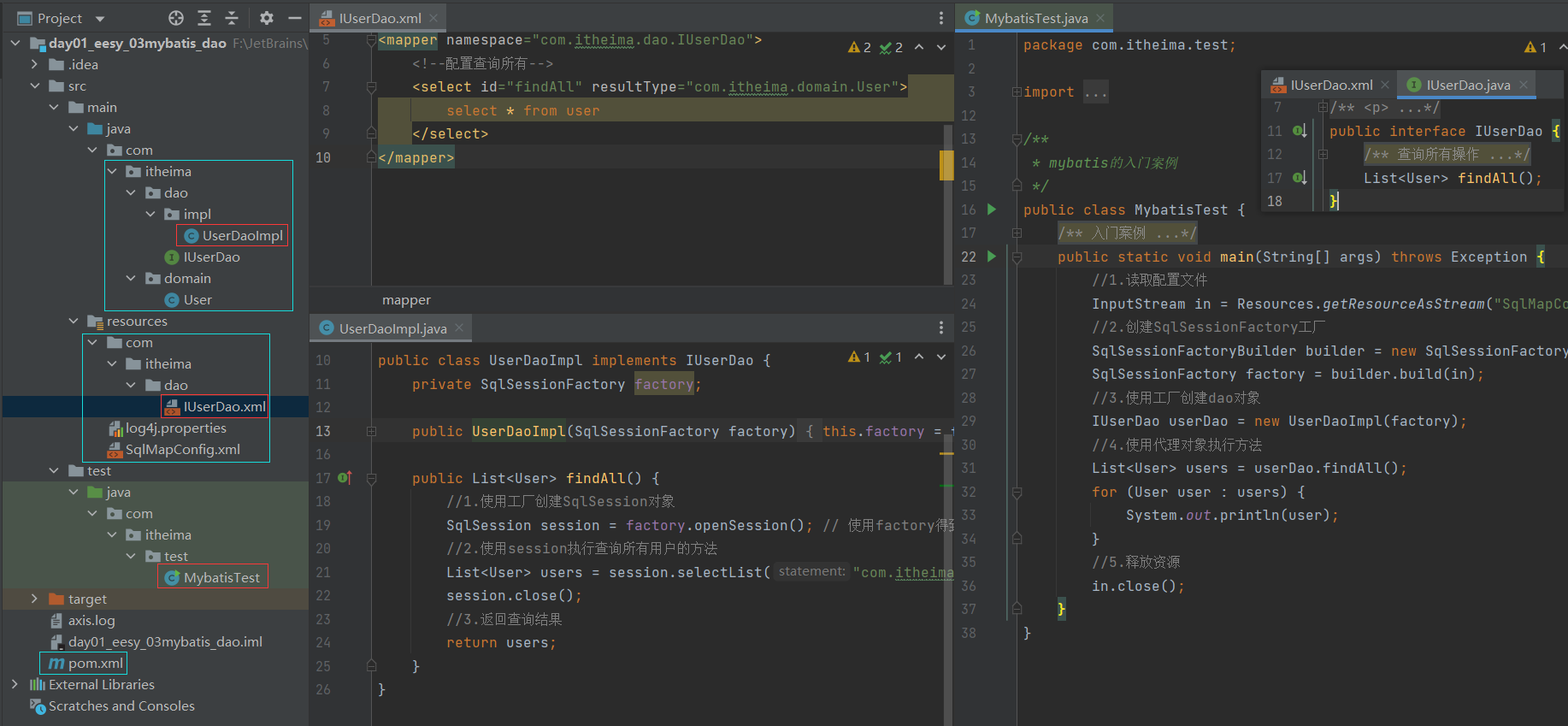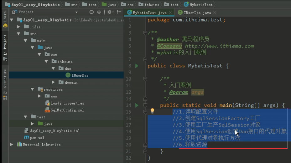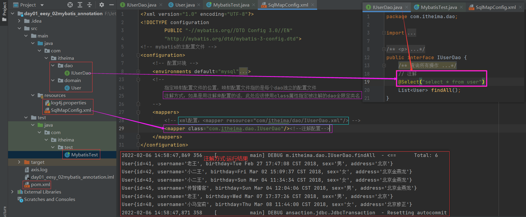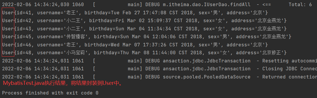 public class MybatisTest {/*** 入门案例** @param args*/public static void main(String[] args) throws Exception {//1.读取配置文件InputStream in = Resources.getResourceAsStream("SqlMapConfig.xml");//2.创建SqlSessionFactory工厂SqlSessionFactoryBuilder builder = new SqlSessionFactoryBuilder();SqlSessionFactory factory = builder.build(in);//3.使用工厂创建dao对象IUserDao userDao = new UserDaoImpl(factory);//4.使用代理对象执行方法List users = userDao.findAll();for (User user : users) {System.out.println(user);}//5.释放资源in.close();}