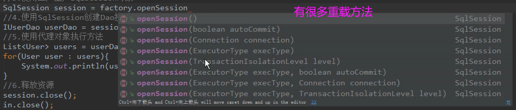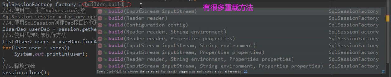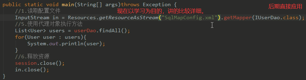 public class MybatisTest {/*** 入门案例** @param args*/public static void main(String[] args) throws Exception {//1.读取配置文件 加载文件中的信息InputStream in = Resources.getResourceAsStream("SqlMapConfig.xml");//连接数据库//2.创建SqlSessionFactory工厂,有了工厂生产操作对象SqlSessionFactoryBuilder builder = new SqlSessionFactoryBuilder();SqlSessionFactory factory = builder.build(in); // SqlSessionFactory接口//3.使用工厂生产SqlSession对象,这个对象操作数据库SqlSession session = factory.openSession();//4.使用SqlSession创建Dao接口的代理对象IUserDao userDao = session.getMapper(IUserDao.class);//代理方式不写dao接口//5.使用代理对象执行方法List users = userDao.findAll();for (User user : users) {System.out.println(user);}//6.释放资源session.close();in.close();}