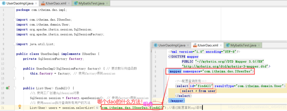 import org.apache.ibatis.session.SqlSessionFactory;import java.util.List;public class UserDaoImpl implements IUserDao {private SqlSessionFactory factory;public UserDaoImpl(SqlSessionFactory factory) { // 更改默认构造函数this.factory = factory; // 使用factory得到session}public List findAll() {//1.使用工厂创建SqlSession对象SqlSession session = factory.openSession(); // 使用factory得到session//2.使用session执行查询所有用户的方法List users = session.selectList("com.itheima.dao.IUserDao.findAll");//通过配置拿到sql语句session.close();//3.返回查询结果return users;}