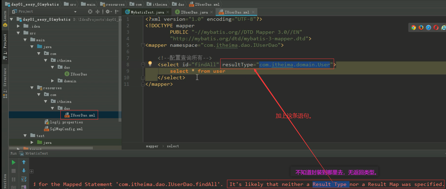 配置的方式:指定实体类的全限定类名 resultType="com.itheima.domain.User"