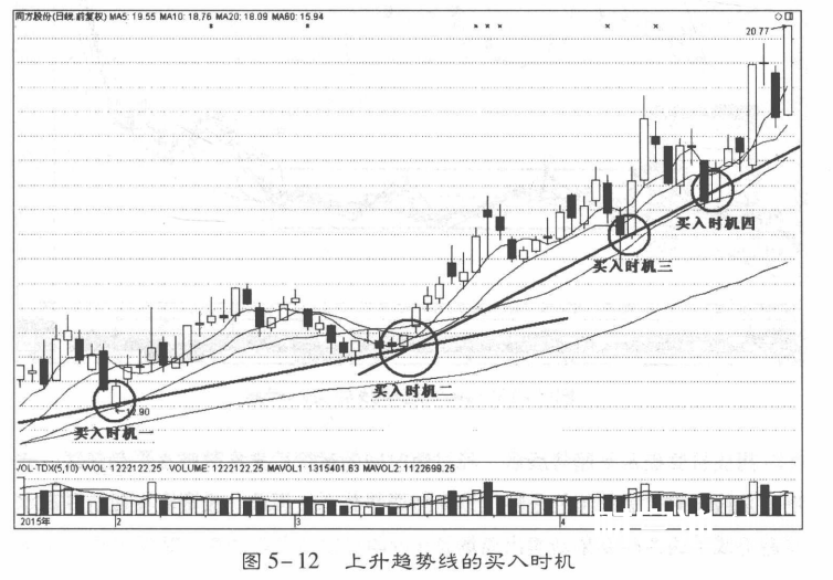 当股价回调到上升趋势线时获得支撑,此时就是投资者买入的一个重要时机(图5-12)。在一波上升趋势中,上升趋势线具备了支撑的作用,当股价回落到趋势线被支撑住后,表明上升趋势还在延续中,股价将继续上涨。投资者可以趁机在每次回落获得上升趋势线支撑时介入,这样就会获得不错的收益。