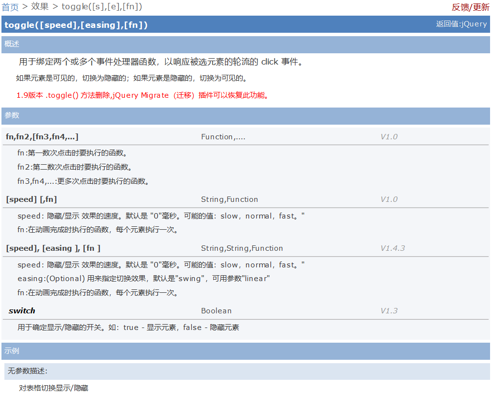 * 注意:1.9版本 .toggle() 方法删除,jQuery Migrate(迁移)插件可以恢复此功能。